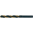 Heavy-duty construction for drilling in tougher materials. Manufactured from high-speed steel. 135° P3 split point is self-centering for reduced thrust and easier penetration. Sizes smaller than .0625" do not have split point. Three flats on the shanks on sizes 3/16" and larger for tighter chucking. Black and gold oxide surface finish increases wear resistance and adds lubricity, improving chip flow. For drilling in stainless steel, tool steel, alloy steel and cast iron